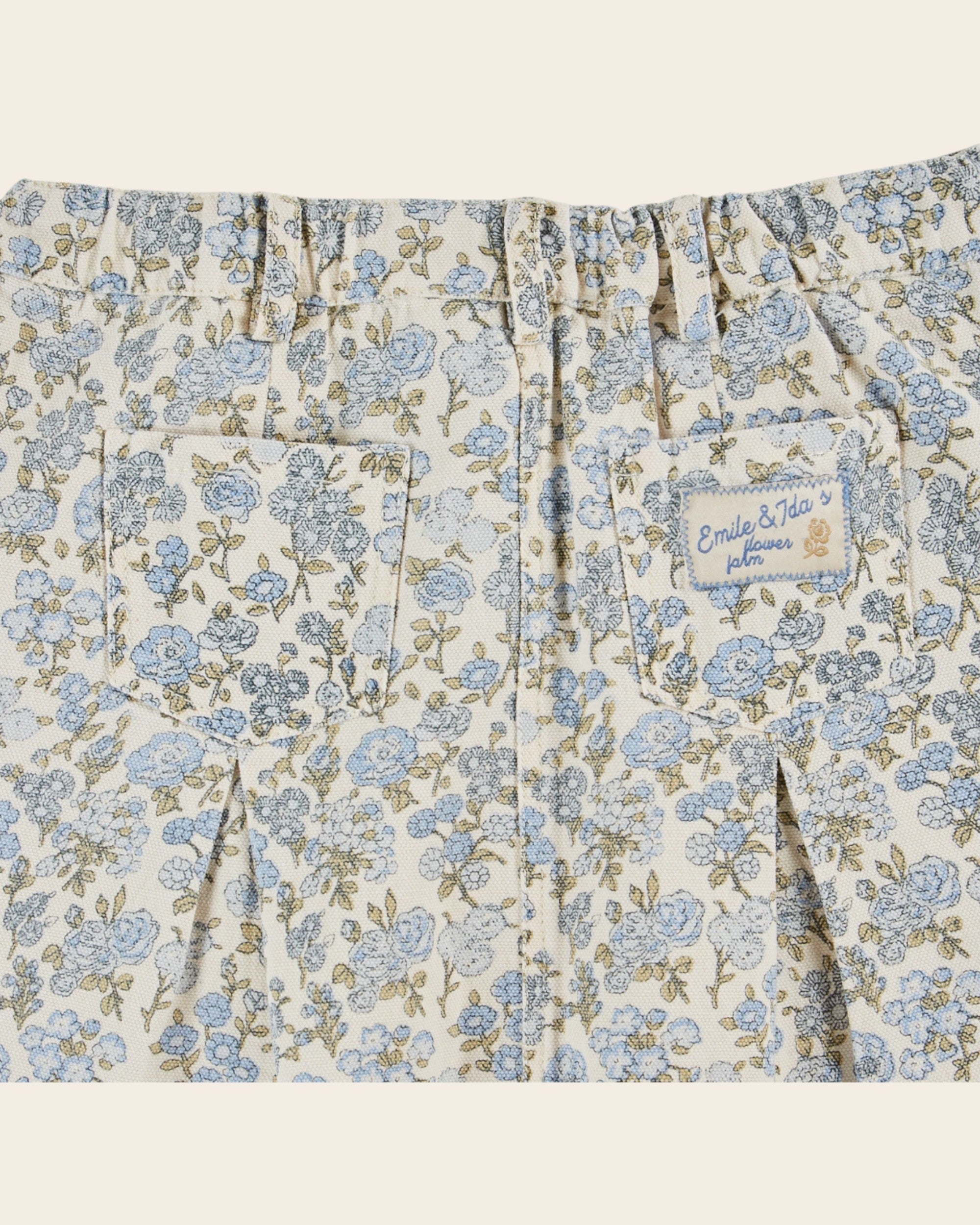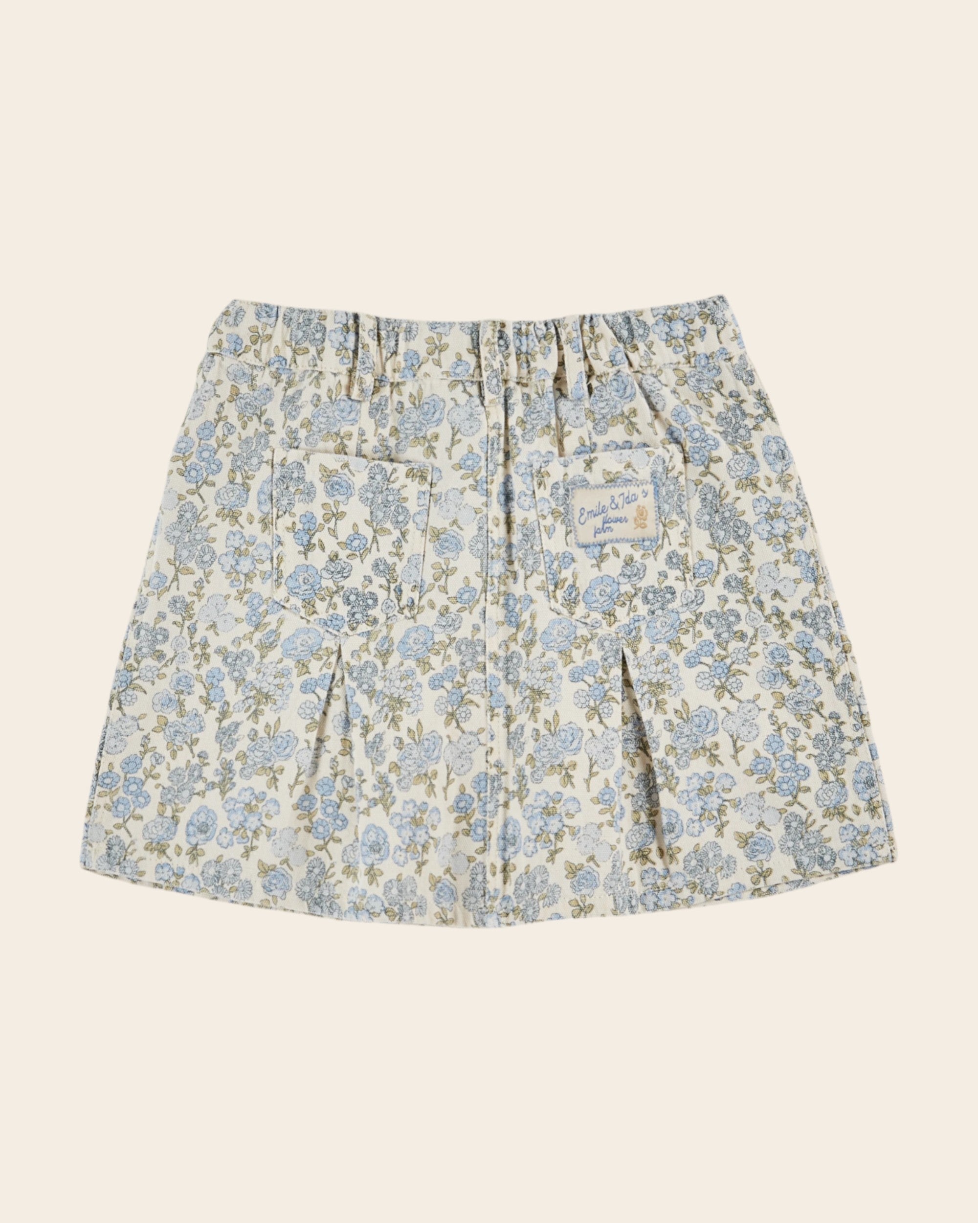 White cotton canvas skirt printed all-over with blue flowers. A short skirt to become one with spring, colors that encourage softness!