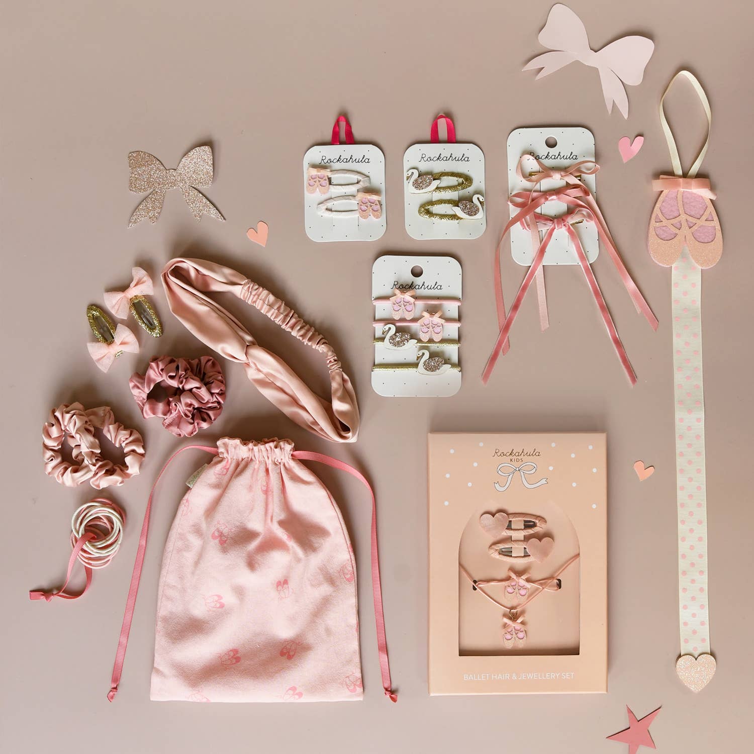 Two pretty little ballet slippers in soft pink glitter, with a beautiful little pink bow. Each is secured onto a pastel pink ribbon wrapped snap clip. Perfect for pirouetting your way through the season!