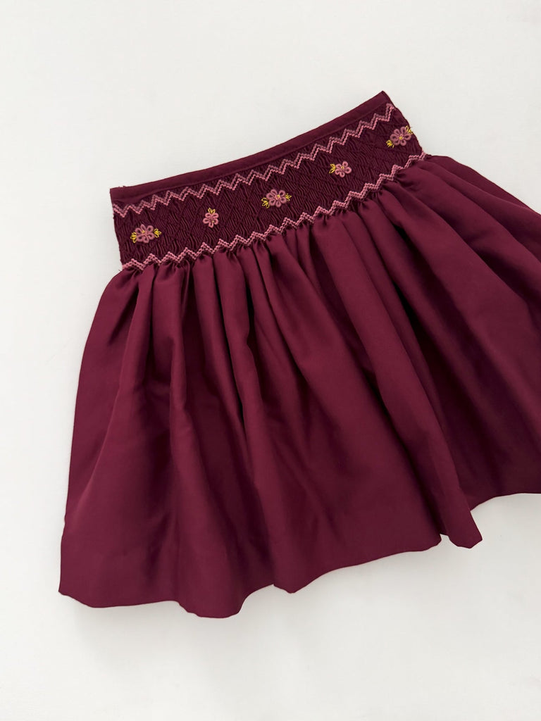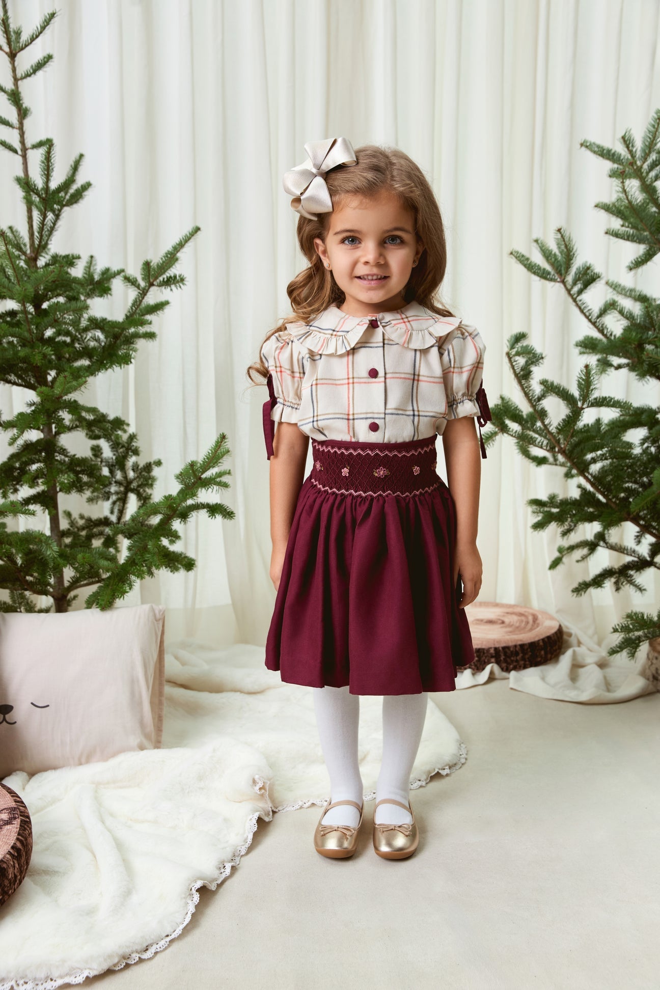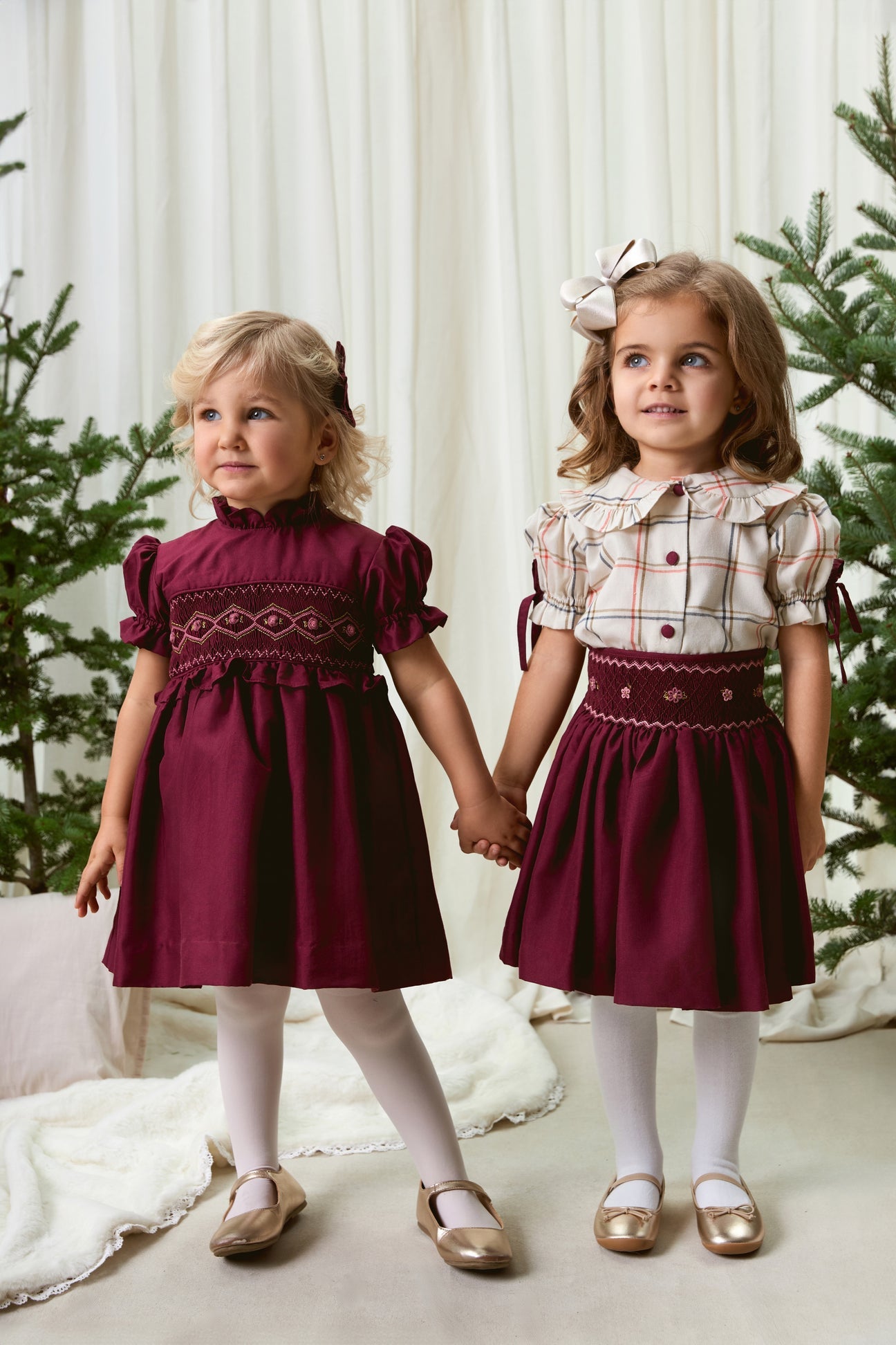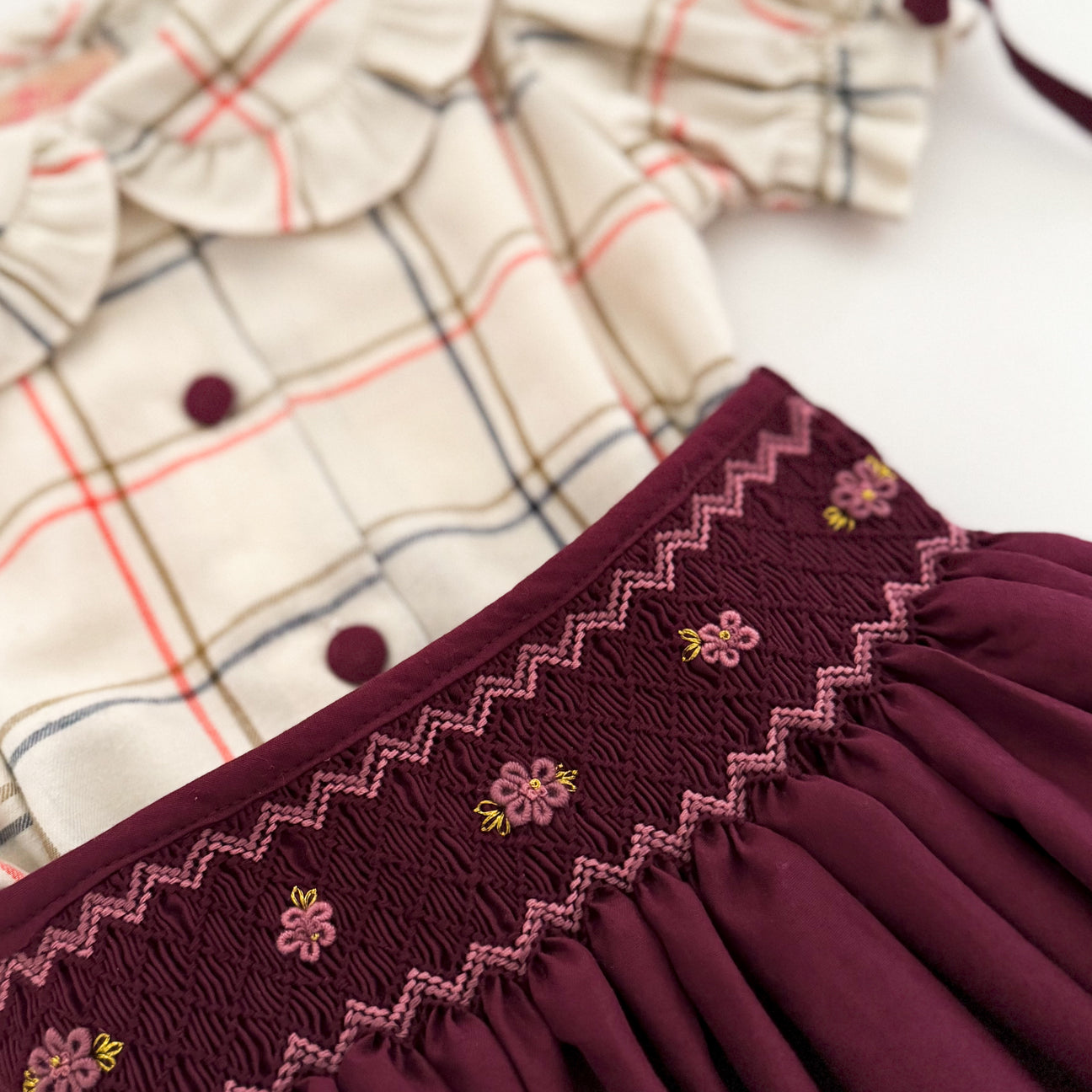 CALISTA Set, crafted from extra-soft plaid cotton for the blouse and burgundy cotton for the fully hand-smocked skirt.