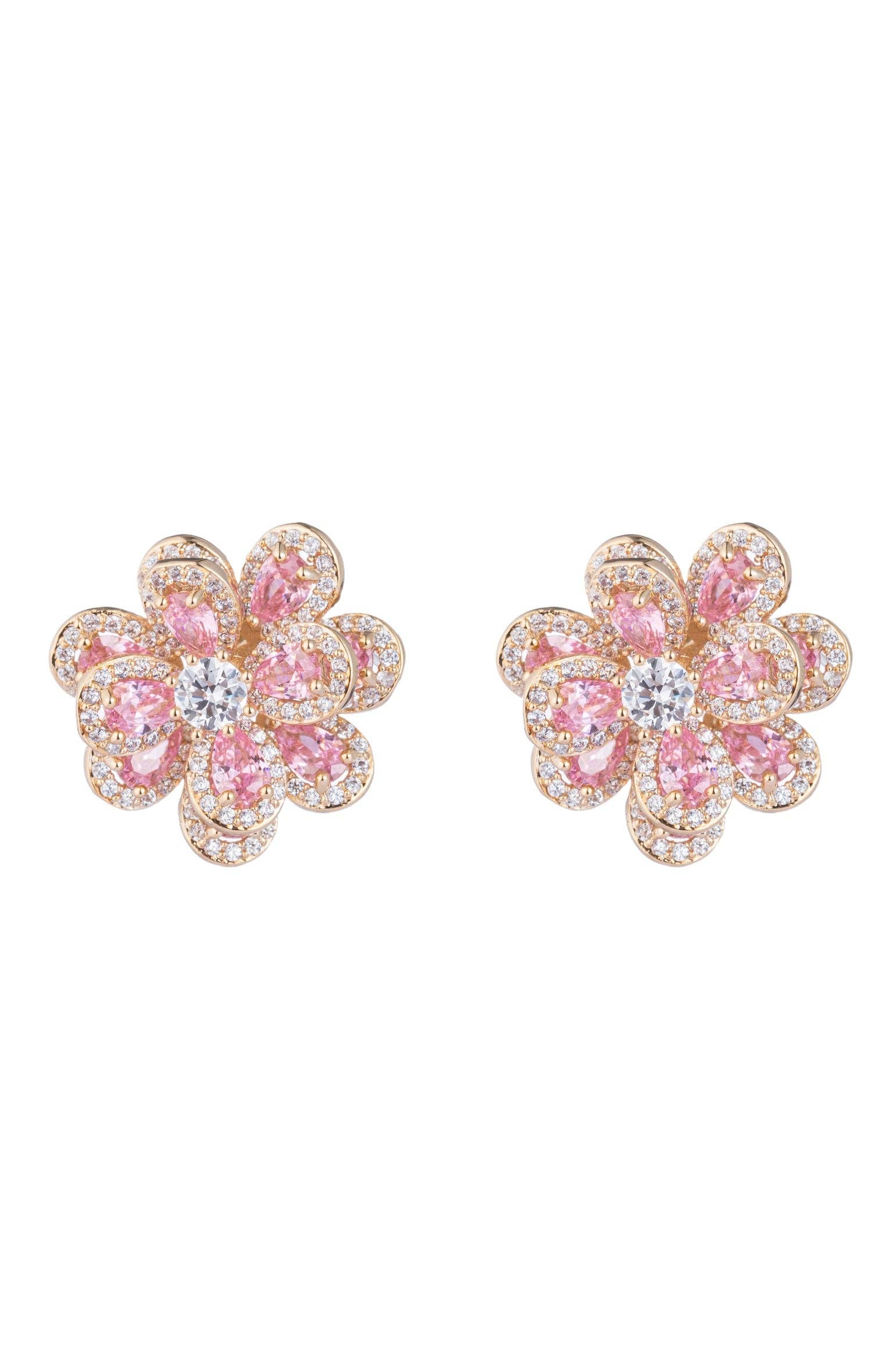 Introduce a touch of refined glamour to your jewelry collection with the Jada Earrings in Pink. These sophisticated stud earrings showcase an enchanting flower motif embellished with radiant CZ crystals that sparkle with every movement. Constructed from premium gold tone brass, they offer a warm, luxurious finish that enhances any skin tone and pairs effortlessly with both classic and contemporary styles. The carefully selected pink-hued crystals add a subtle pop of color while maintaining an air of understated elegance. Designed for comfort and security, the pushback clasp keeps your earrings securely fastened throughout your day, making them ideal for both professional settings and special occasions. Whether you're seeking a versatile everyday piece or a polished accent for evening wear, these flower earrings deliver timeless beauty with contemporary flair. A must-have addition for anyone who appreciates quality craftsmanship and refined aesthetics.