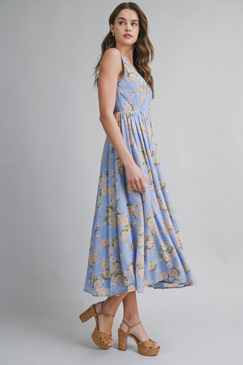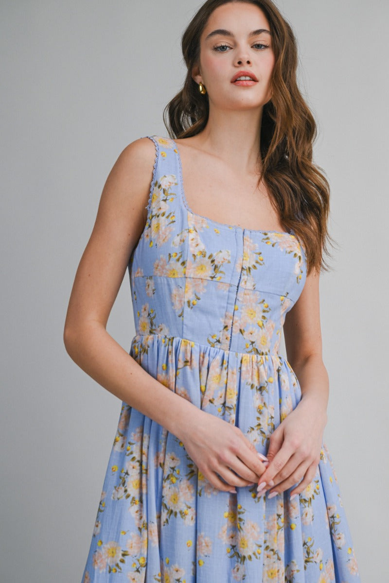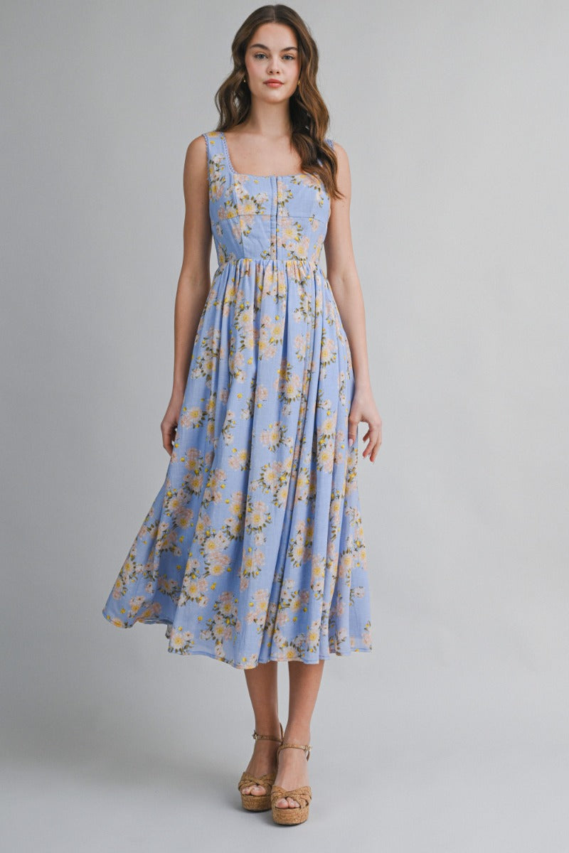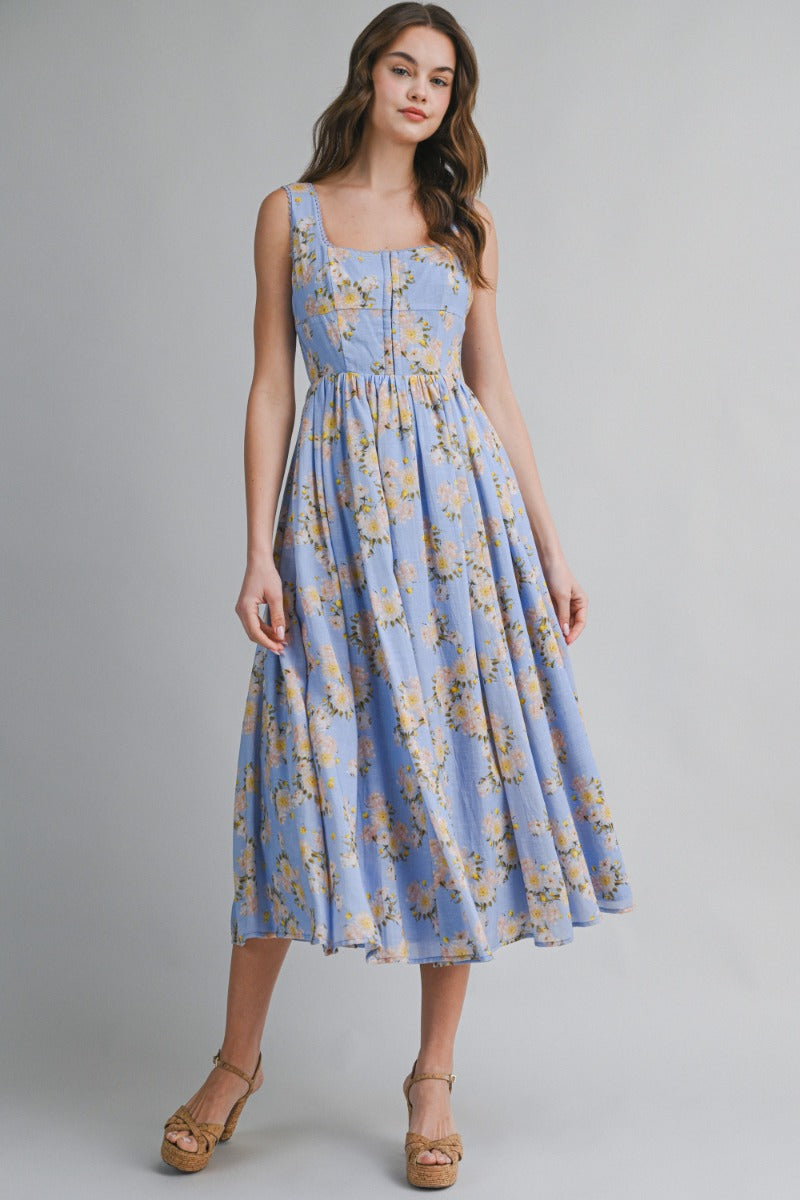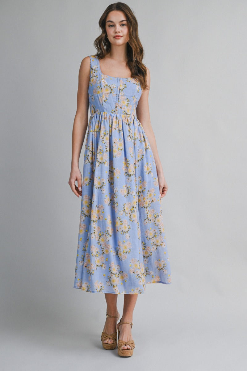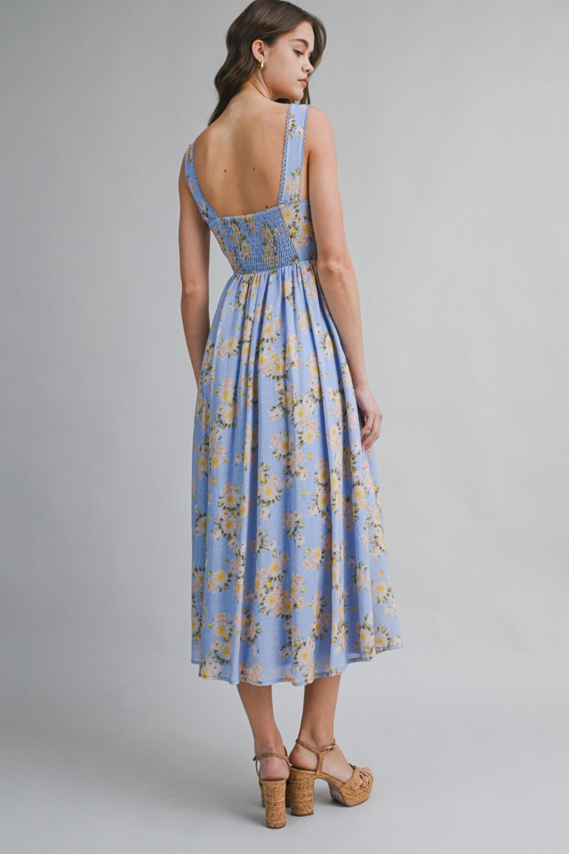 Discover timeless elegance with the Olivia Floral Midi Dress in a calming periwinkle shade. This refined piece showcases an exquisite allover floral print that adds visual interest while maintaining understated sophistication. The sleeveless design features a graceful square neckline and generously proportioned shoulder straps that provide both support and style. A secure hook and eye closure at the bodice ensures a refined, tailored appearance. The dress is expertly constructed with a fitted bodice that flatters the silhouette, while the smocked elastic back panel offers gentle shaping and ease of movement. Fully lined for a luxurious feel and impeccable drape, this midi dress is an investment piece that transitions effortlessly from brunch to evening events. Ideal for the discerning woman who values quality craftsmanship and enduring style.