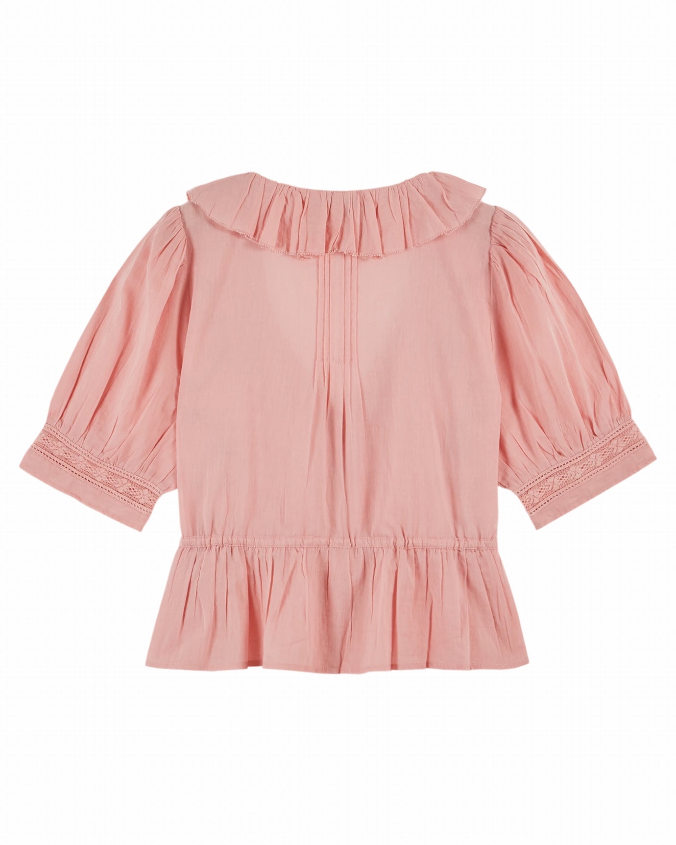 Vintage pink organic cotton voile blouse with ruffled neckline. Subtle embroidered and openwork flowers embellish the front.