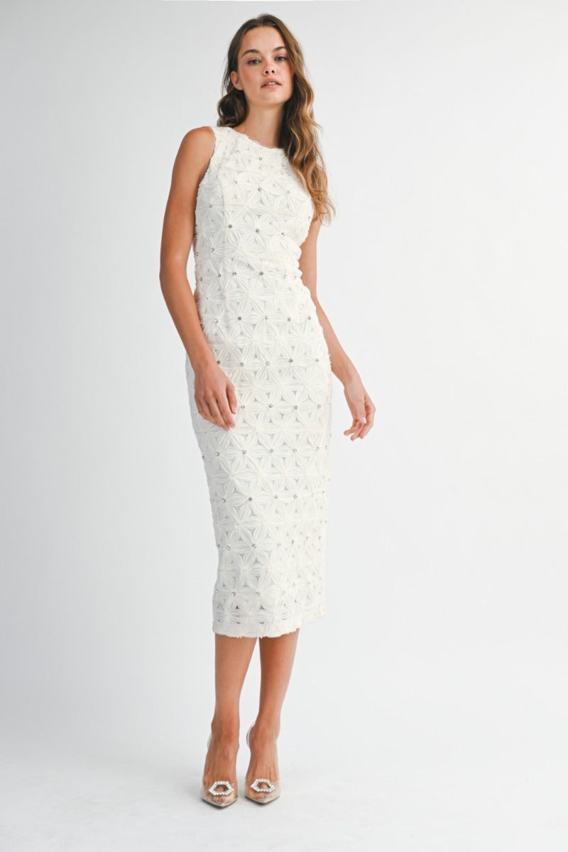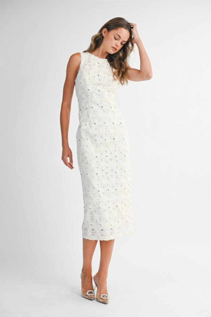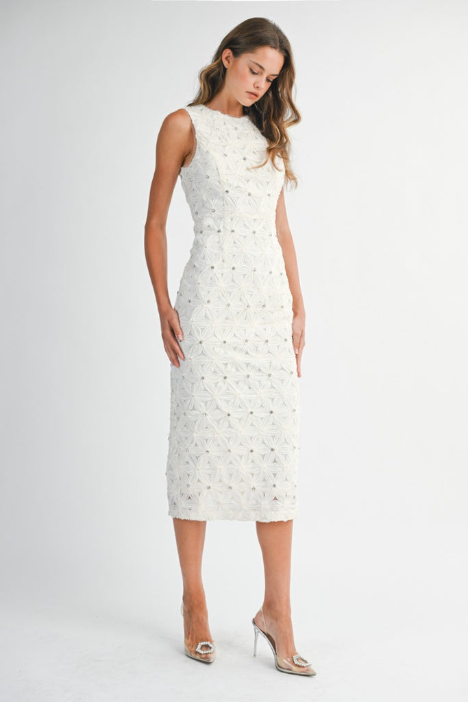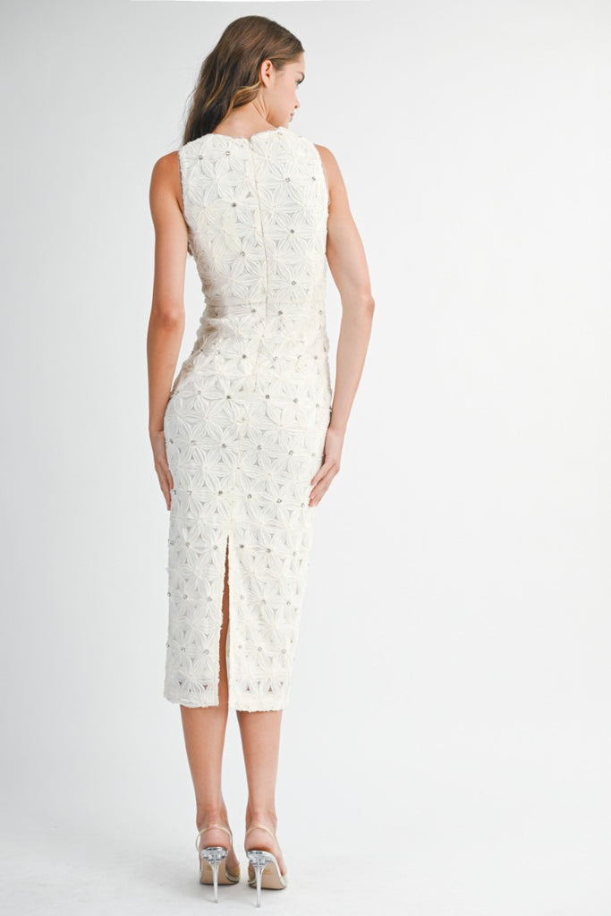 Discover refined elegance with the Blair Floral Appliqué Midi Dress in cream. This stunning design showcases a sleeveless silhouette enhanced by intricate floral appliqués and sparkling rhinestone accents that add a touch of glamour. The fitted bodycon construction flatters your silhouette while the midi length provides sophisticated coverage. Thoughtfully designed with a concealed back zipper for a polished appearance and a tasteful slit that allows comfortable movement. The fully lined interior ensures a smooth, comfortable wear throughout the day or evening. Made from a durable blend of 88% polyester and 12% nylon, this dress is perfect for weddings, galas, cocktail parties, and any occasion calling for understated luxury and refined style.