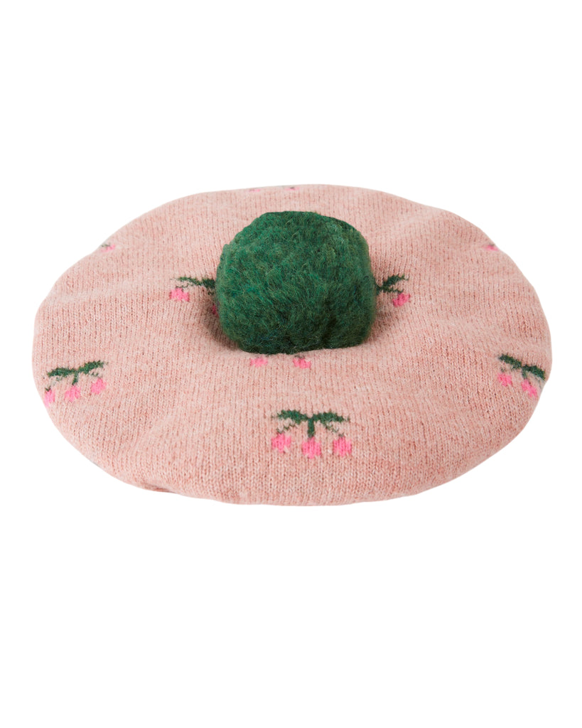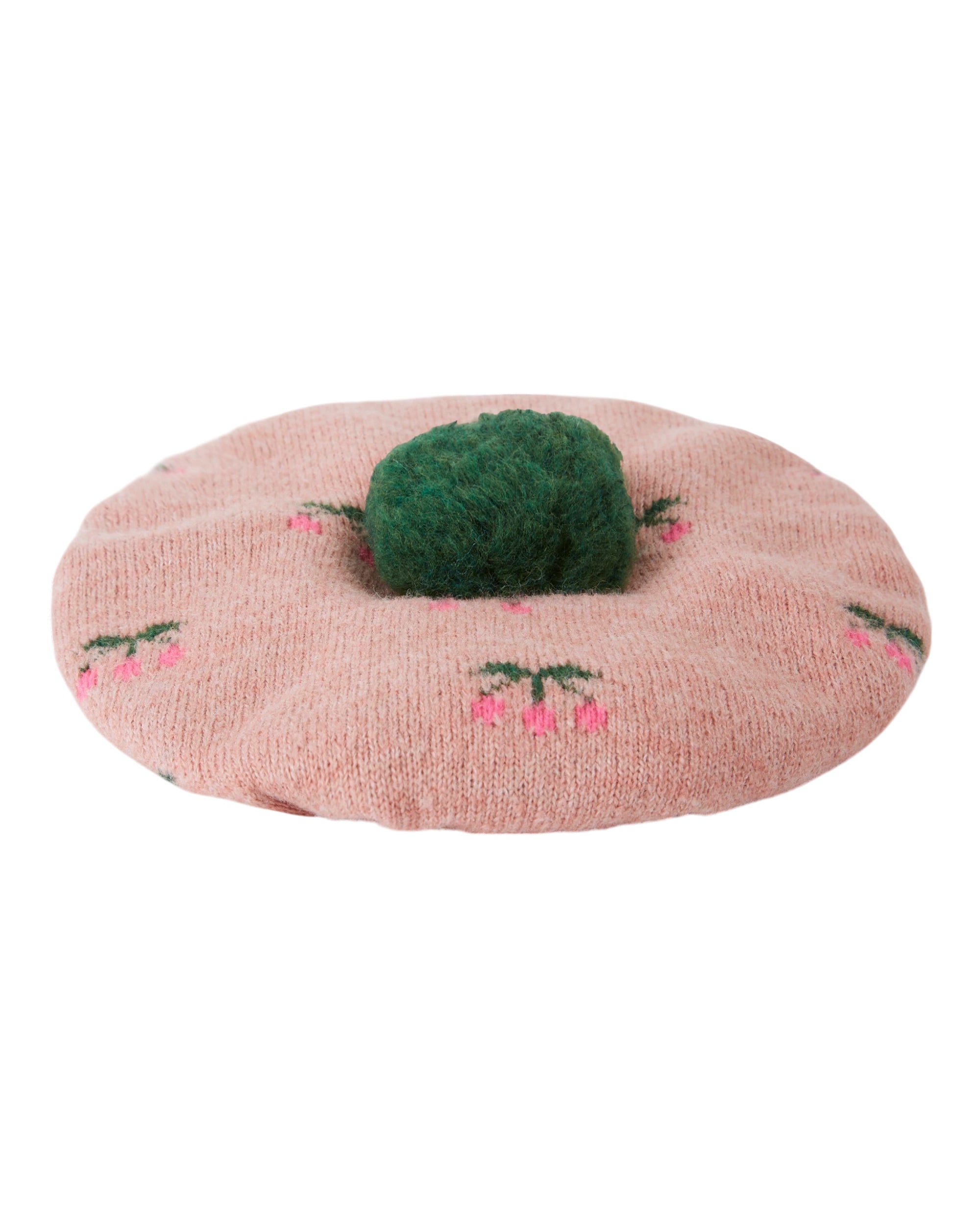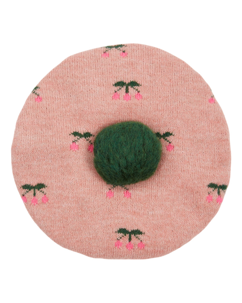 Add a splash of whimsy to your wardrobe with this playful pink pompom beret. Crafted from a cozy wool blend with unbleached synthetic fibers, it’s knitted in a soft jersey stitch for a comfortable feel. Delightful cherries are cleverly woven into the fabric using the expert Monsieur Jacquard technique, bringing a charming twist to classic style. The big blue pompom at the center adds a fun pop of color, while the elasticized base ensures a snug, secure fit all day long. Perfect for brightening up any outfit with a touch of cheerful elegance.