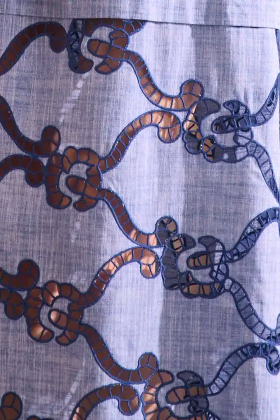 Rowe delivers instant wow. Cut in our Seabank Chambray, a custom cut-out embroidered linen, it frames the figure with a square neckline and crochet lace that traces the bodice, skirt, and sleeves. Ladder and bobble trims add soft dimension, and the midi silhouette feels effortlessly flattering with a look that is beautifully eye-catching from every angle