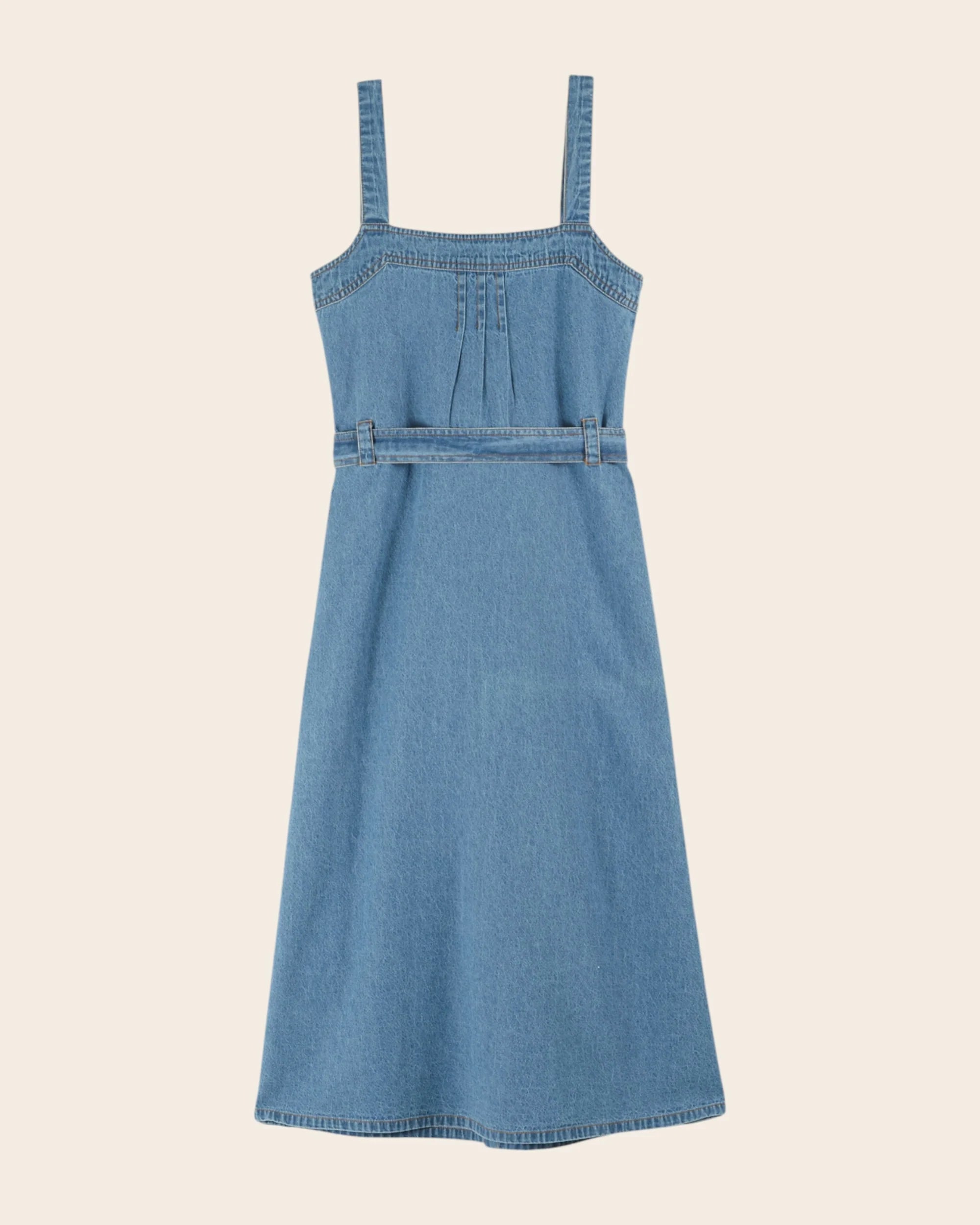 Light blue denim cotton dress with straps. The darts at the chest and waist hug the body's curves.