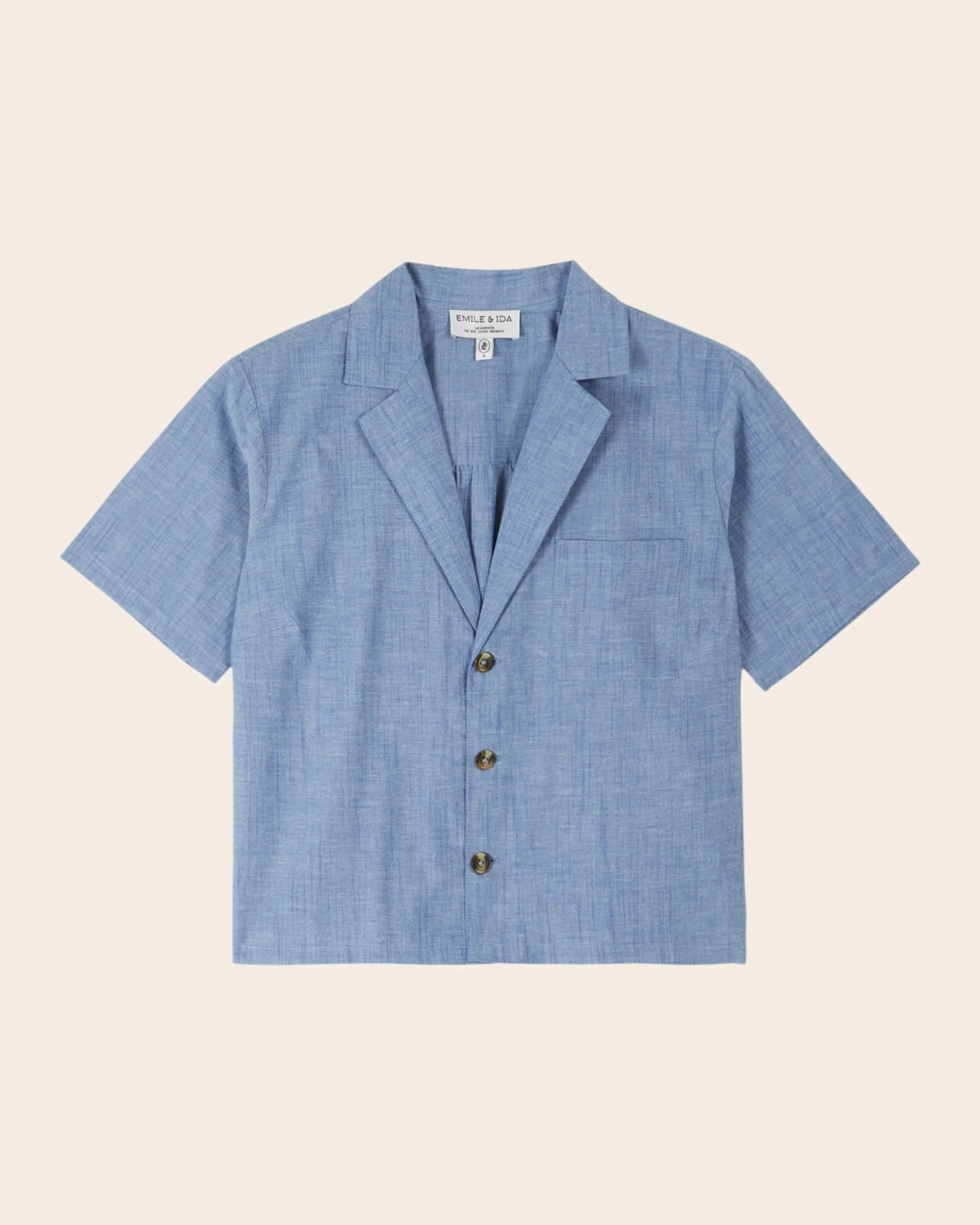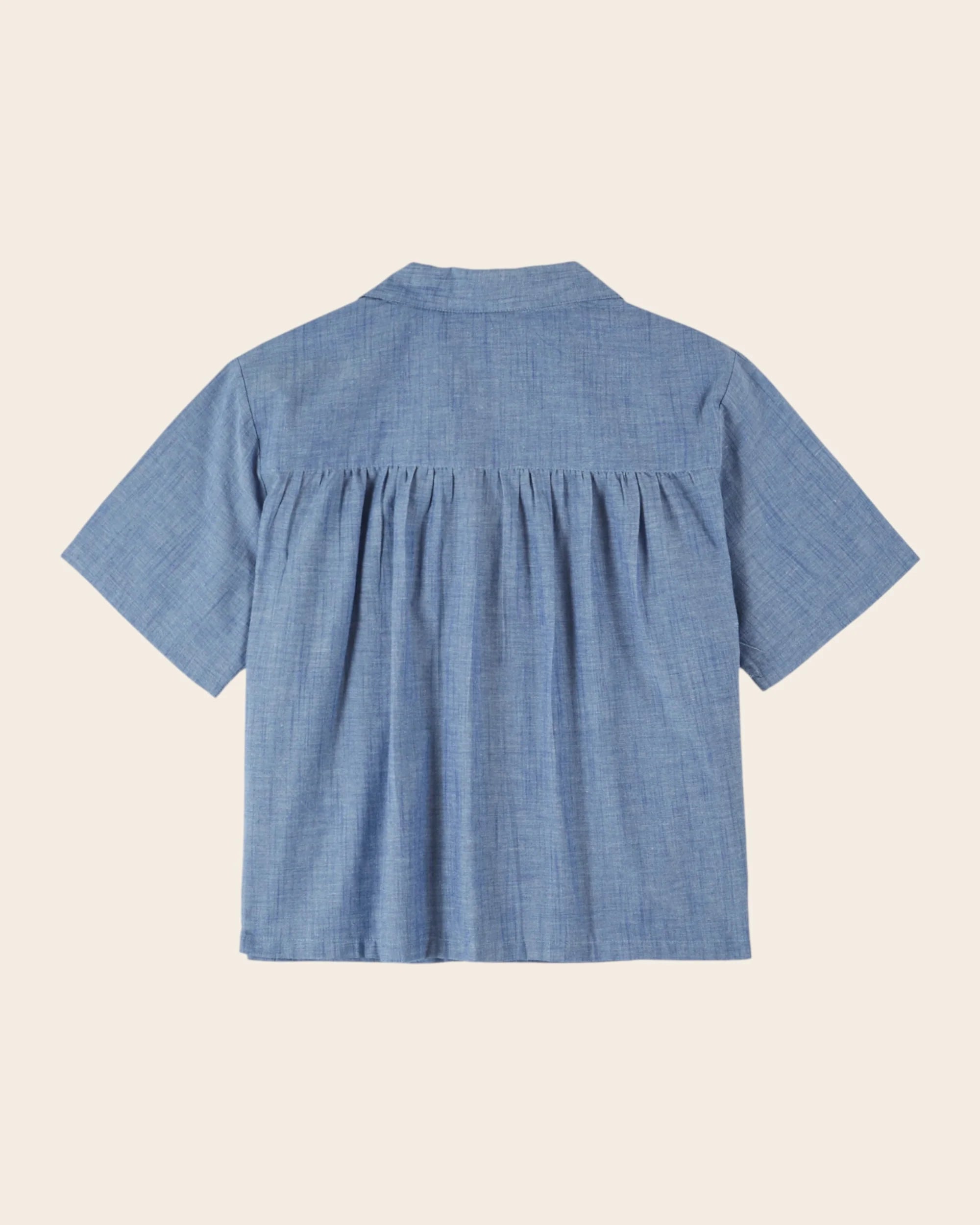 Short-sleeved blue chambray shirt.