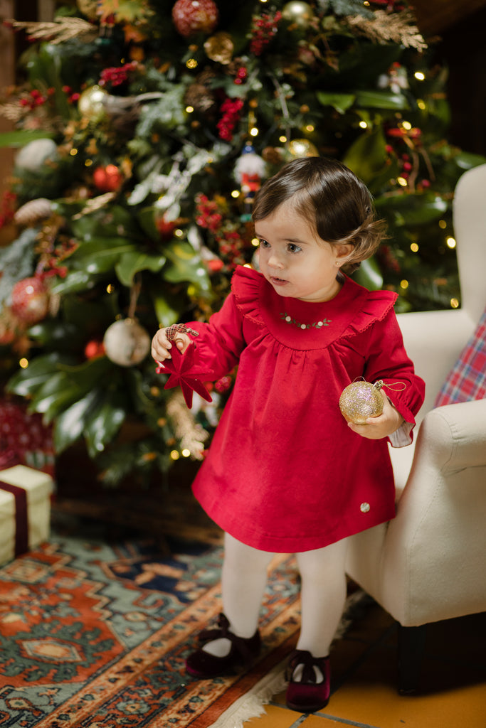 This adorable red velvet dress for baby girls from PAZ Rodríguez features charming floral embroidery on the front and delicate ruffles on the shoulders. With long sleeves finished with frilled cuffs, a soft cotton lining for comfort, and a hidden back zip, it’s a sweet and cozy choice for your little one.