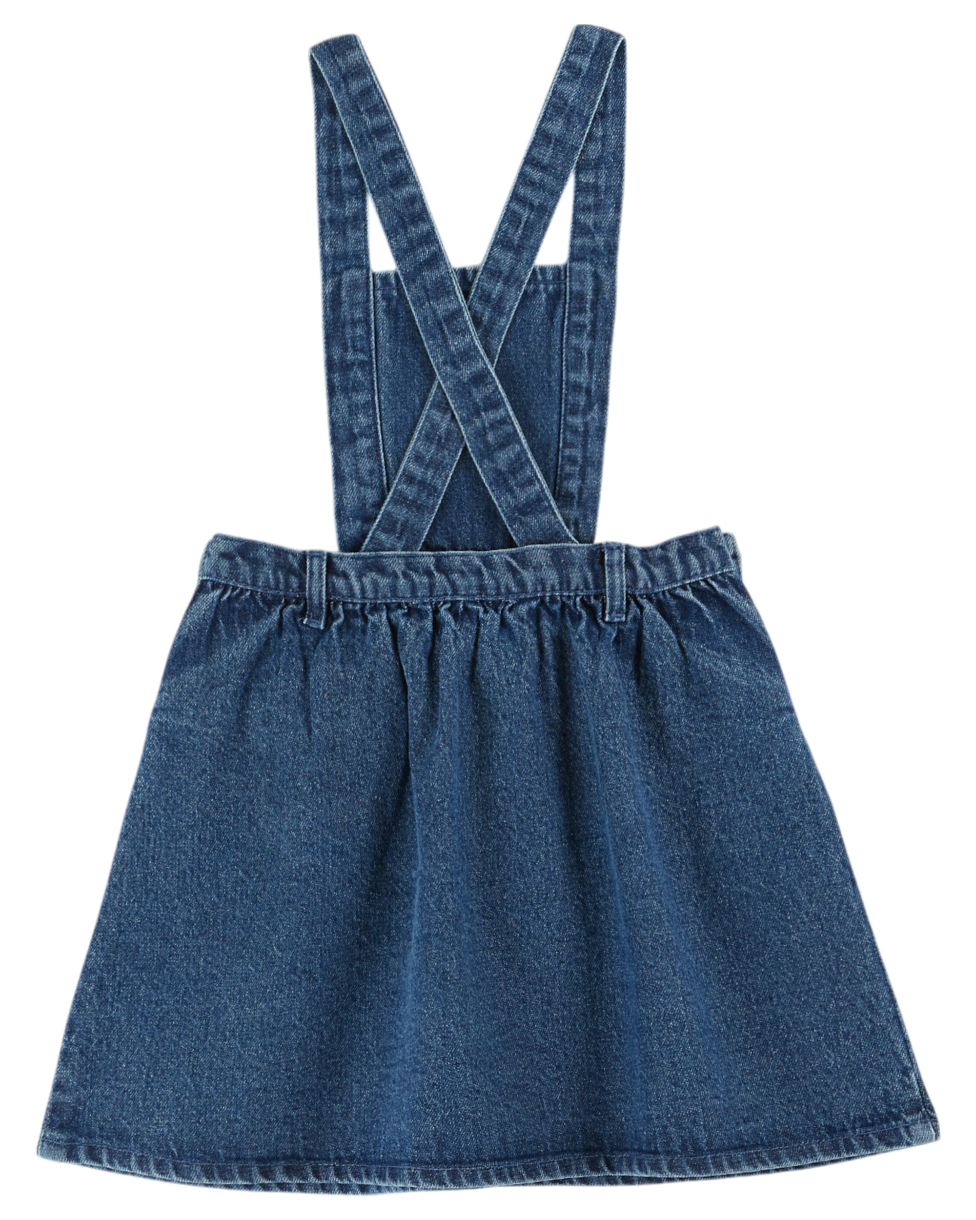 This playful cotton denim apron dress combines comfort and charm effortlessly. Featuring a flared skirt that swings with your every move, it has a soft cotton denim lined bib for a cozy fit. Adjustable straps with buttons at the waistband let you find your perfect shape, while the gathered fabric under the waistband adds a flirty touch. Front flower pockets bring a splash of fun and functionality, perfect for keeping little treasures close. Side buttoned openings make dressing and undressing a breeze, turning this apron dress into a versatile favorite for your casual days.